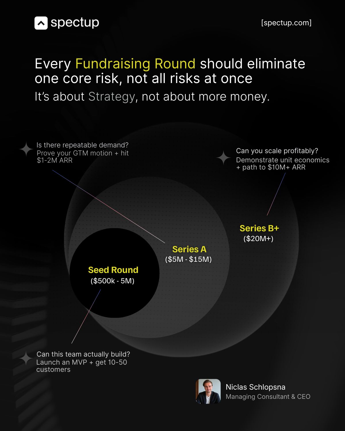 Pre-seed | $100K – $1M | $2M – $8M | Angels, friends & family, accelerators | The problem is real and you can build |