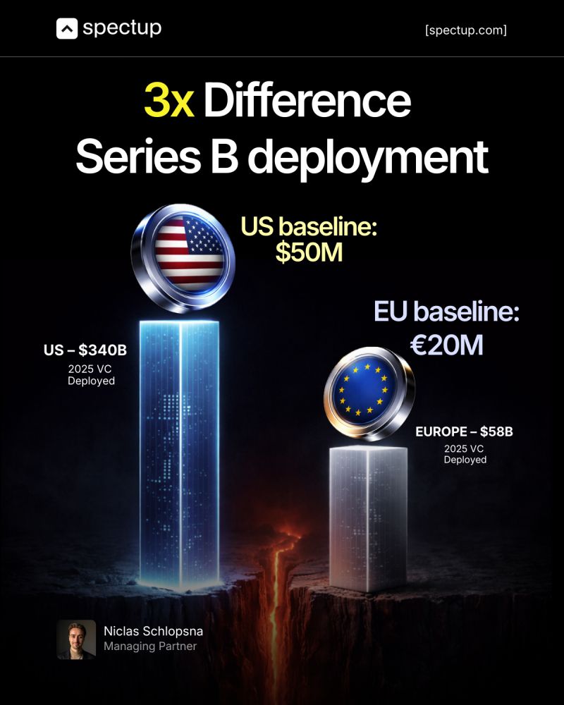 The average series b round size in the US right now: $50M baseline. What is a series b funding round in Europe worth? €20M if you're lucky.