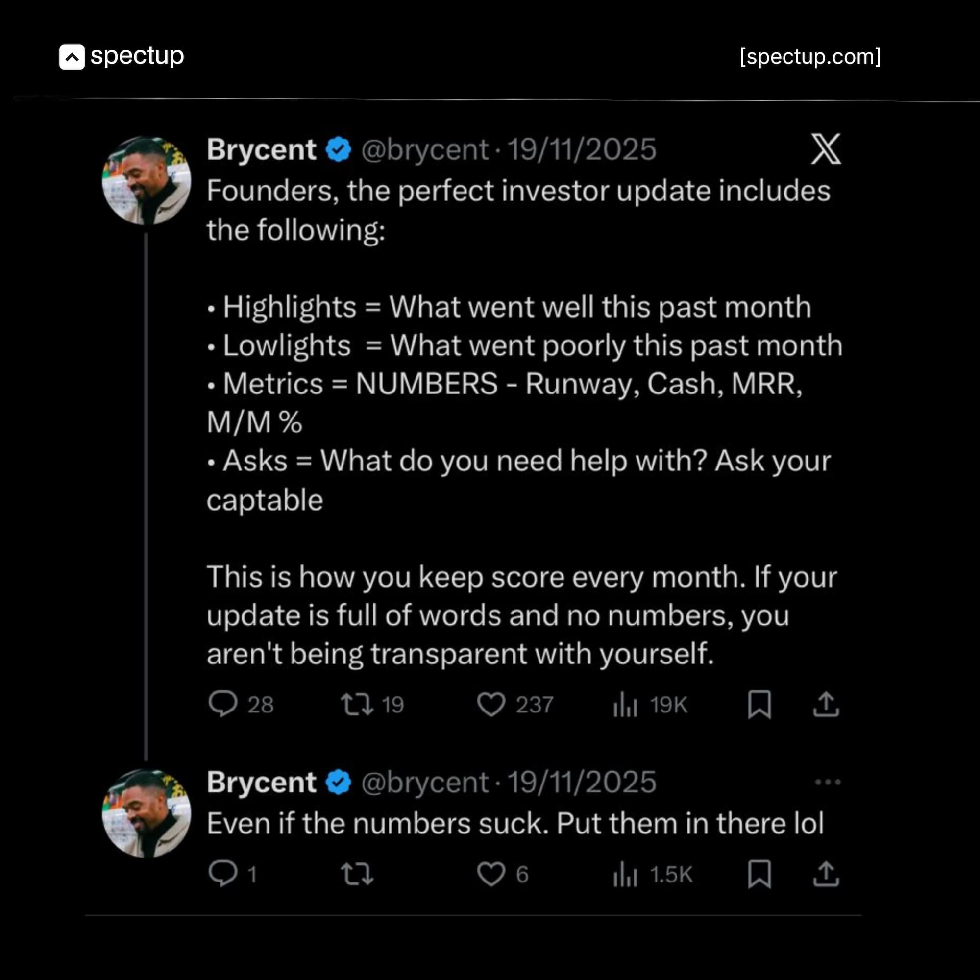 I tell founders this constantly: your investor update newsletter is not a chore. It's the first draft of your next round's investment memo. Write it like the IC is reading, because eventually, they will be.